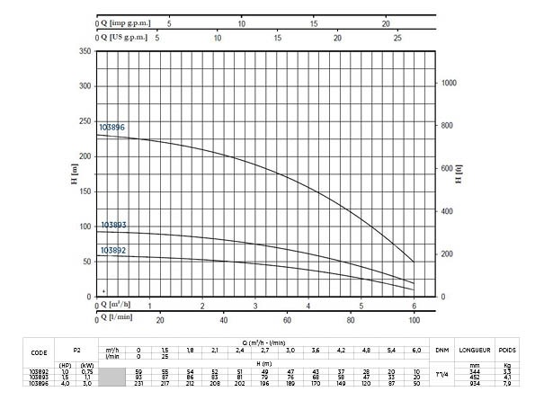Hydraulique 100 l/min pour pompes de forage de diamètre 4’’ pour usages industriels ou agricolesCompatible avec un moteur 0.75 kWAvantages :Souplesse d'utilisation quant à la qualité de l'eau grâce aux turbines flottantesRigidité et résistance maximales aux coups de bélierGrande résistance abrasive à l’action du sableExcellent rendement hydraulique