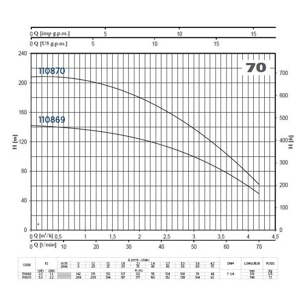Hydraulique 70 l/min pour pompes de forage de diamètre 4’’ pour usages industriels ou agricolesCompatible avec un moteur 1.5 kWAvantages :Souplesse d'utilisation quant à la qualité de l'eau grâce aux turbines flottantesRigidité et résistance maximales aux coups de bélierGrande résistance abrasive à l’action du sableExcellent rendement hydraulique